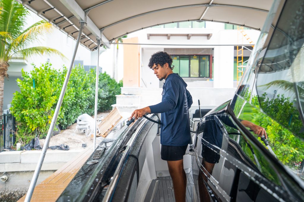 Our mobile teams service Naples, Marco Island, Bonita, and Fort Myers, arriving fully equipped with deionized water systems, power solutions, and marina-compliant washdown gear to deliver meticulous yacht detailing at your dock or lift with minimal disruption.