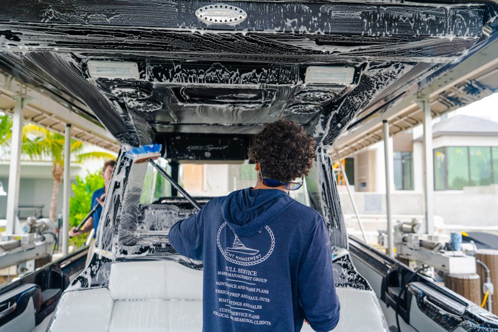 Every project is performed by trained marine detailers following documented checklists and manufacturer-safe methods. We use deionized water for spot-free rinsing, pH-balanced soaps safe on protective layers, non-skid–specific chemistry, plastic-safe polishes for clear enclosures, and marine-grade polishes and sealants. Sensitive areas are masked and protected, test spots are completed before full correction, and all work is insured and aligned with marina guidelines.